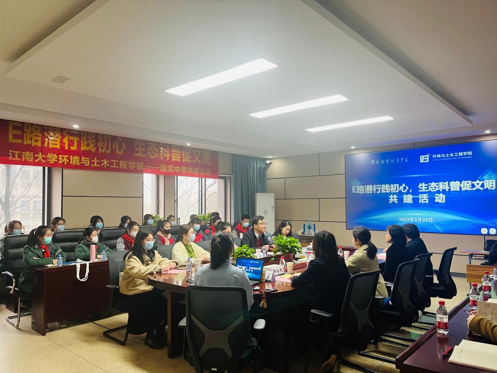 生态兴则文明兴,中国式现代化是人与自然和谐共生的现代化,必须牢固树立和践行绿水青山就是金山银山的理念,站在人与自然和谐共生的高度谋划发展。2023年3月23日,环境与土木工程学院与无锡市湖滨中学在学院楼D305开展“E路潜行践初心,生态科普促文明”主题共建活动,无锡市湖滨中学党委书记 夏敏、办公室副主任兼党支部书记夏益稚、团委书记兼大队辅导员华芳,江南大学团委副书记单云婷,环境与土木工程学院党委书记李艳、院党委副书记兼副院长胡娟、教工环境二支部书记郁红艳出席本次活动,活动由院团委书记兼学工办主任周佳赟主持。