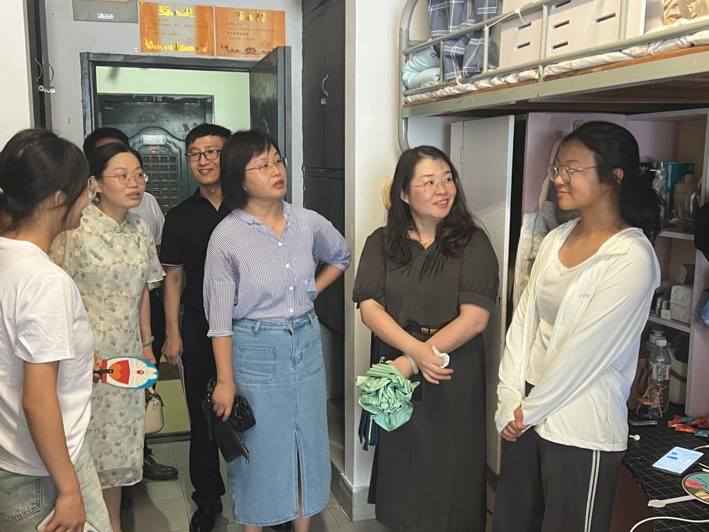 党委书记李艳、党委副书记胡娟一行前往新生宿舍走访慰问,详细询问同学们入校后遇到的各种困难和问题,并对新生入学教育、军训工作、课业学习等进行解答。暖心话语、谆谆教诲、亲切慰问,让环境学子倍感学院大家庭的热情与温暖。