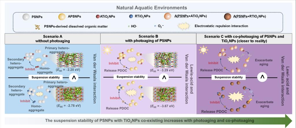 三)基于密度泛函理论和多分子尺度量子化学计算,率先明确了纳米塑料和纳米二氧化钛的共光老化及对两者异相团聚的影响机制。光老化是最重要的纳米塑料环境化学转化过程之一,随着纳米技术的快速发展,纳米二氧化钛(TiO2NPs)等光催化纳米污染物与纳米塑料的环境共存不可避免,然而,纳米塑料和TiO2NPs的异相团聚行为及其共光老化和环境归趋仍不清楚。团队以聚苯乙烯纳米塑料(PSNPs)和两种纳米二氧化钛(锐钛矿型,ATiO2NPs和金红石型RTiO2NPs)为研究对象开展批次异相团聚实验,结果表明,PSNPs+RTiO2NPs的临界团聚浓度(CCC)是PSNPs+ATiO2NPs的1.9−2.2倍,表明PSNPs+RTiO2NPs具有更好的悬浮稳定性。老化聚苯乙烯纳米塑料(APSNPs)和TiO2NPs的CCC比PSNPs和TiO2NPs的CCC大1.7−2.2倍,表明光老化抑制了其异相团聚,这是由于APSNPs表面增加的负电荷及其释放的塑料源溶解性有机碳所产生的静电斥力增加所致。共存TiO2NPs在紫外光照射下产生的羟基自由基和超氧阴离子促进了PSNPs的氧化,从而抑制了其异相团聚。量子化学计算的结果表明,范德华力和路易斯酸作用分别主导了TiO2NPs和PSNPs(E = ‒2.20~‒2.78 eV)及APSNPs(E = ‒3.29~‒3.67 eV)间初级异相团聚体的形成。